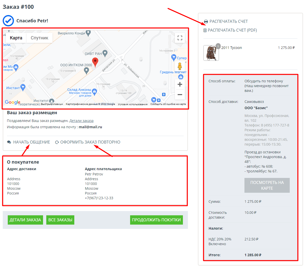 Как правило, посетитель, совершивший покупку в магазине, видит малоинформативную страницу с подтверждением размещения его заказа. Наш модуль сделает эту страницу не просто информативной, но и полезной: масштабируемая карта с отображением адреса доставки, кнопки для начала коммуникации с продавцом (уведомление будет продублировано администратору маркетплейса) и повторного оформления заказа, быстрый доступ к просмотру счета и все остальные подробности заказа - исчерпывающая информация на одной странице!