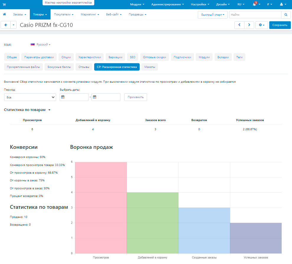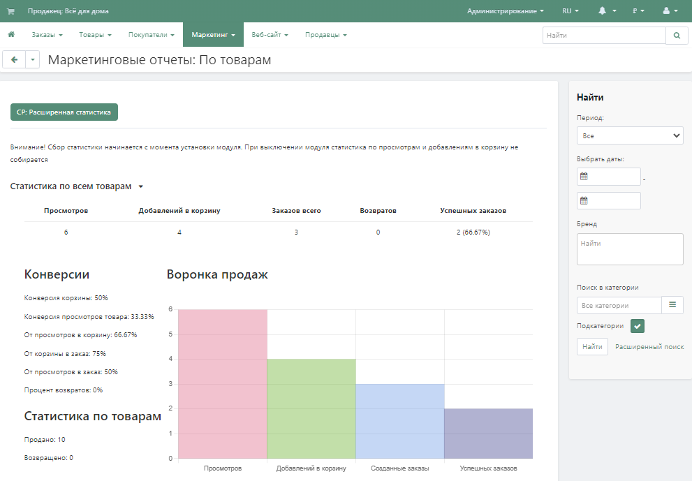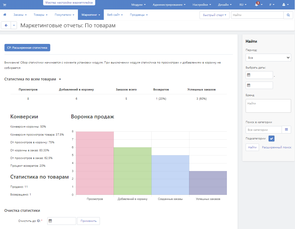 Маркетинговый отчет по товарам предоставит вам полную картину общего состояния дел вашего магазина: вы увидите процент конверсии от просмотров, сможете оценить эффективность рекламы и рассчитать стоимость ваших затрат на привлечение одного реального покупателя.