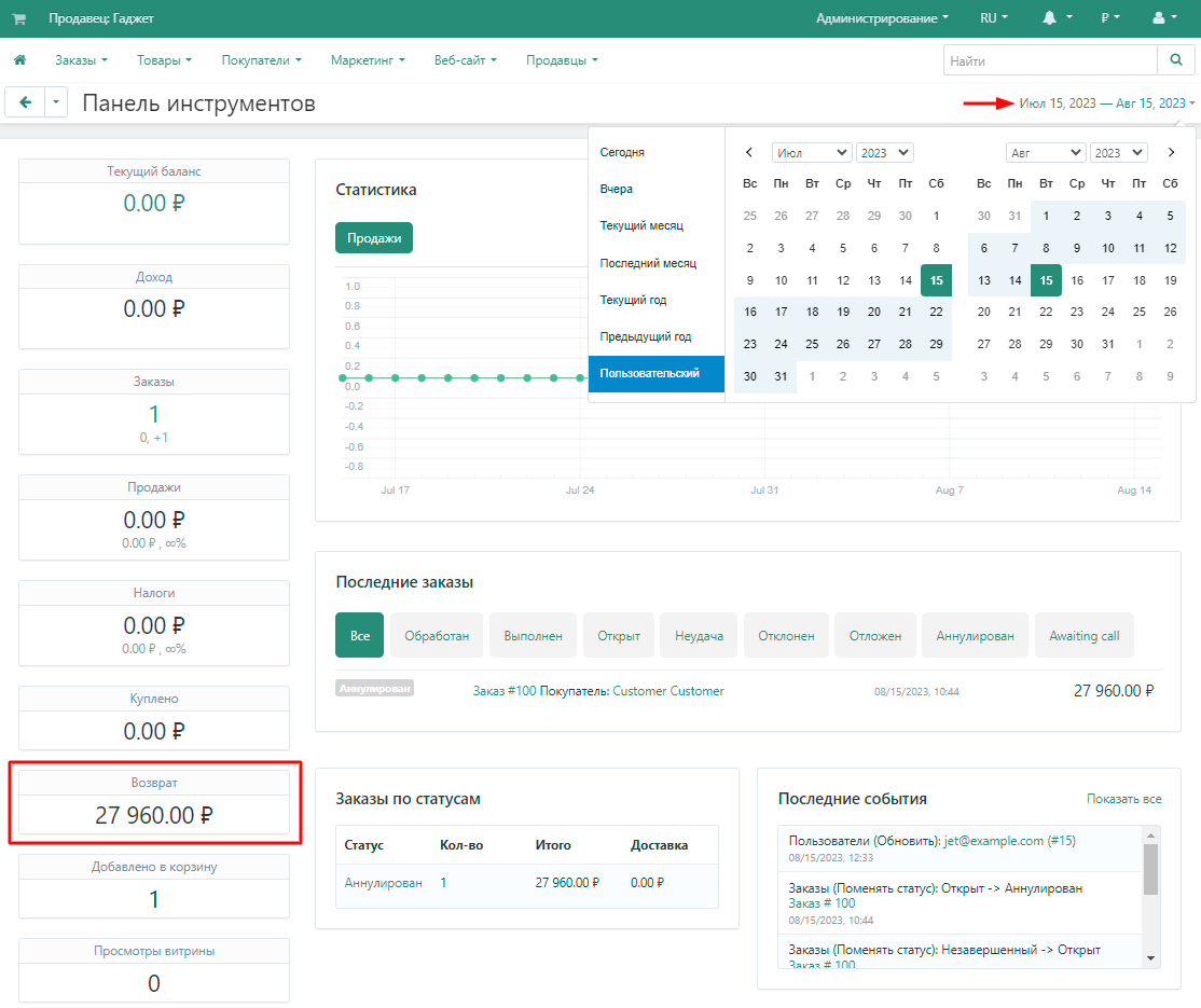 В версии Multi-Vendor продавец имеет полный доступ к статистике товаров и заказов своего магазина.