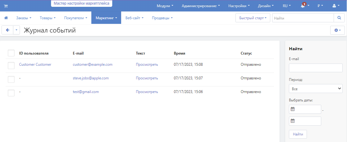 Ведется журнал отправленных уведомлений, который позволит просмотреть каждое отправленное уведомление, провести анализ содержимого, а также пополнить свою базу адресами для рассылки.