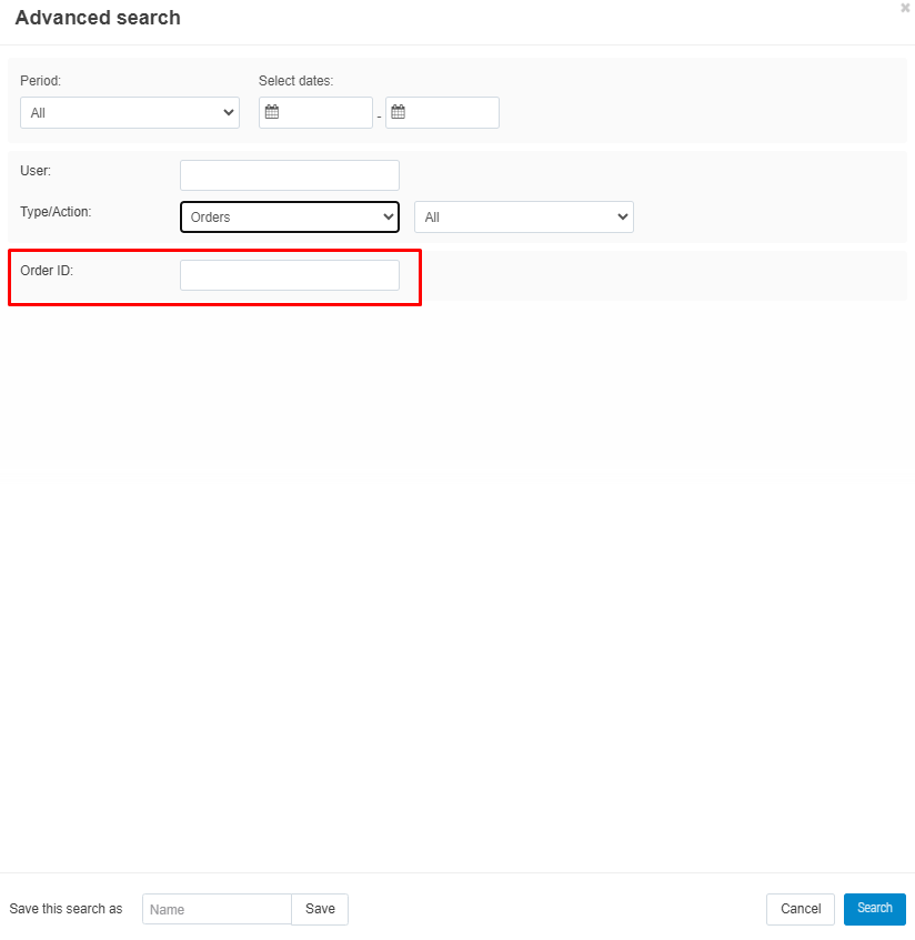 В зависимости от выбранного вами значения в селектбоксе Тип/Действие появляются дополнительные поля для поиска: ID пользователя, ID администратора, ID товара, ID категории, номер заказа, название товара или название категории.